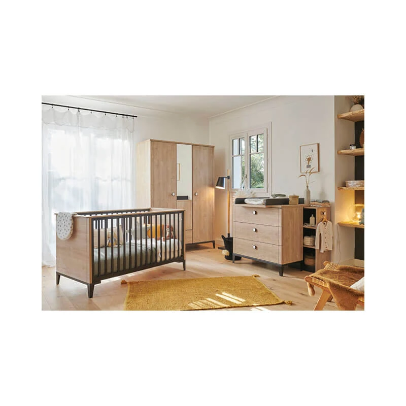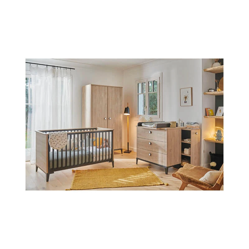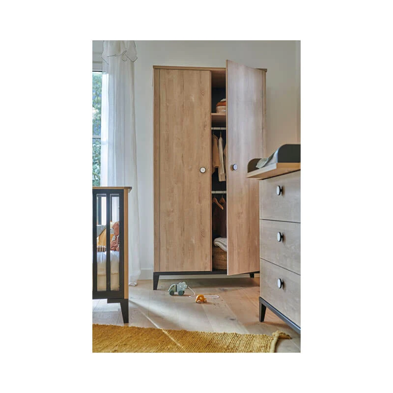 L’armoire 2 portes Marcel Chêne blond Noir de Galipette est un meuble de rangement compact et élégant qui vient garnir la chambre de bébé avec goût dès la naissance.