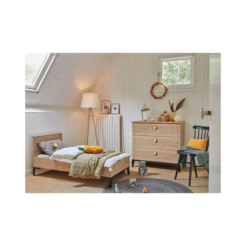 Tendance, ce meuble en particules de bois revêtus de papier imitation chêne blond présente des détails noirs caractéristiques de la gamme qui lui confèrent un look élégant.