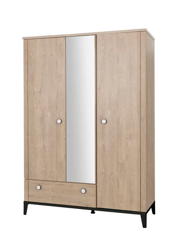 L’armoire 3 portes et 1 tiroir Marcel Chêne blond Noir de Galipette est un meuble de rangement spacieux et élégant qui vient garnir aménager la chambre de bébé dès la naissance.