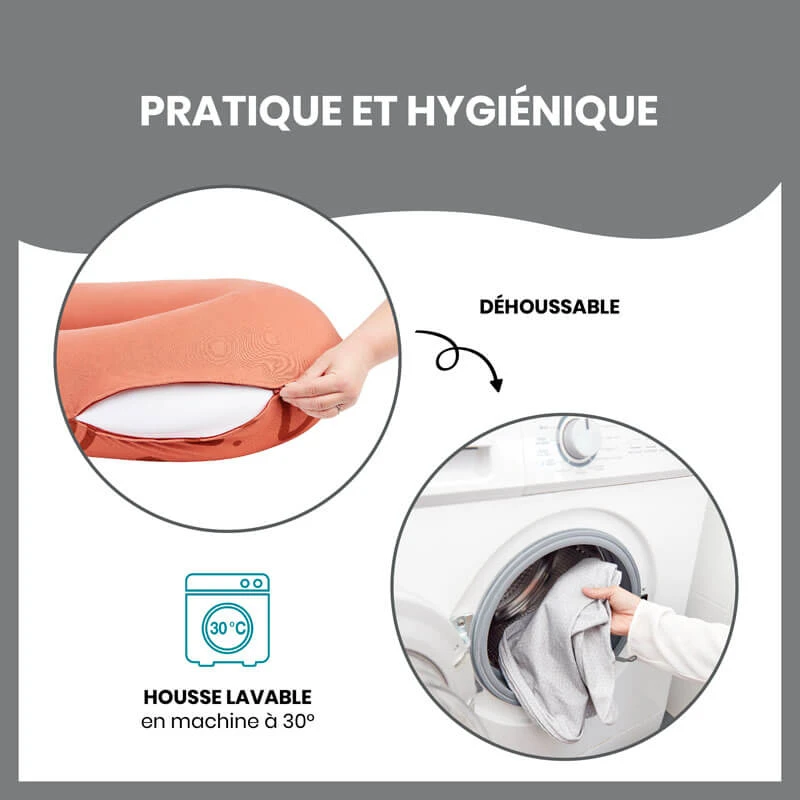 Ce coussin a été conçu pour apaiser les maux de grossesses (mal de dos, douleurs lombaires, tiraillement en bas du ventre, jambes lourdes…).