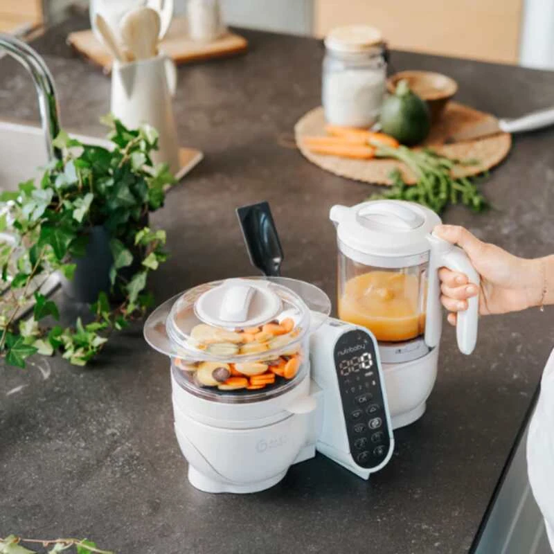 - 6-en-1, il propose différentes fonctions : cuisson à la vapeur, mixage, décongélation, stérilisation et chauffe-biberons et chauffe petits pots.