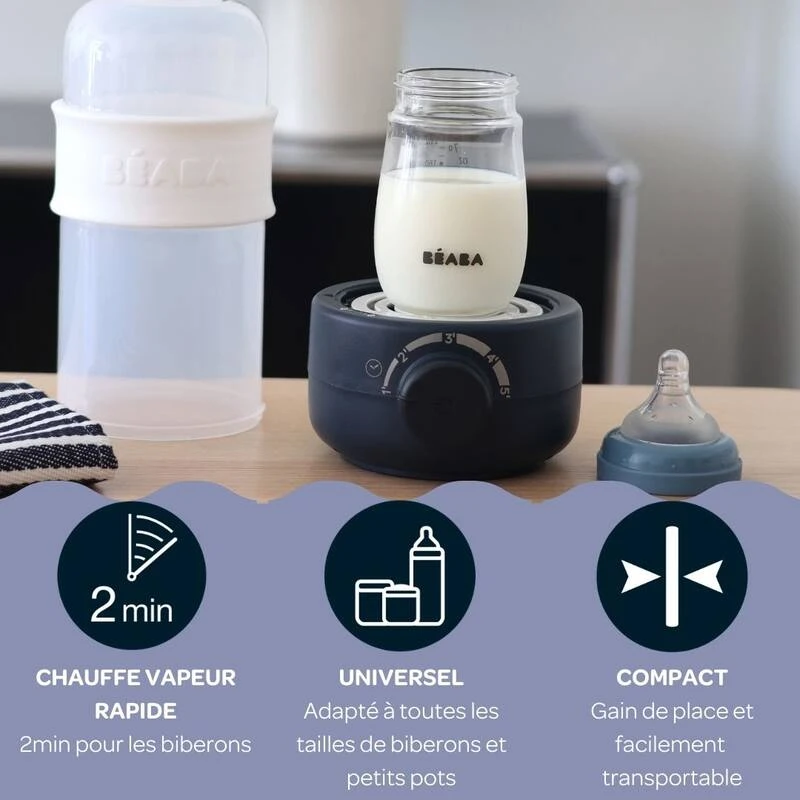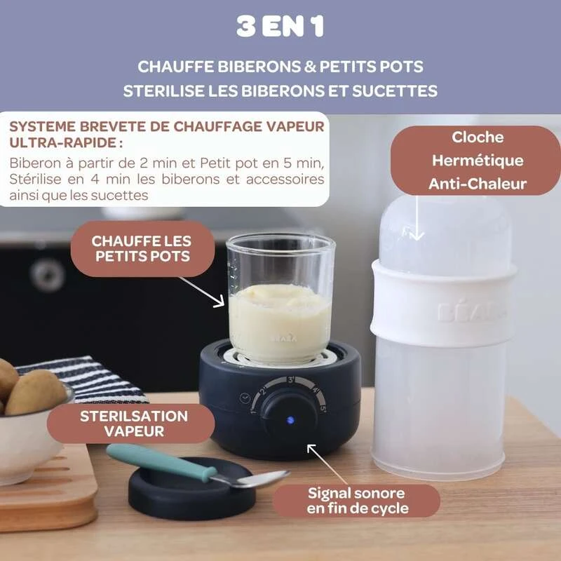 - Il permet de rechauffer rapidement le biberon de votre enfant (2 minutes seulement) ainsi que les petits pots ( 5 minutes).