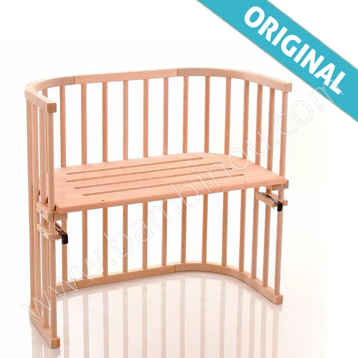 Avec son cadre et sa plateforme en bois de hêtre massif ainsi que ses côtés arrondis, ce berceau s’accroche au lit des parents à une hauteur de 12 à 52,5 cm et s’intègre parfaitement dans la chambre. Il est non traité et non peint pour un effet naturel garanti !