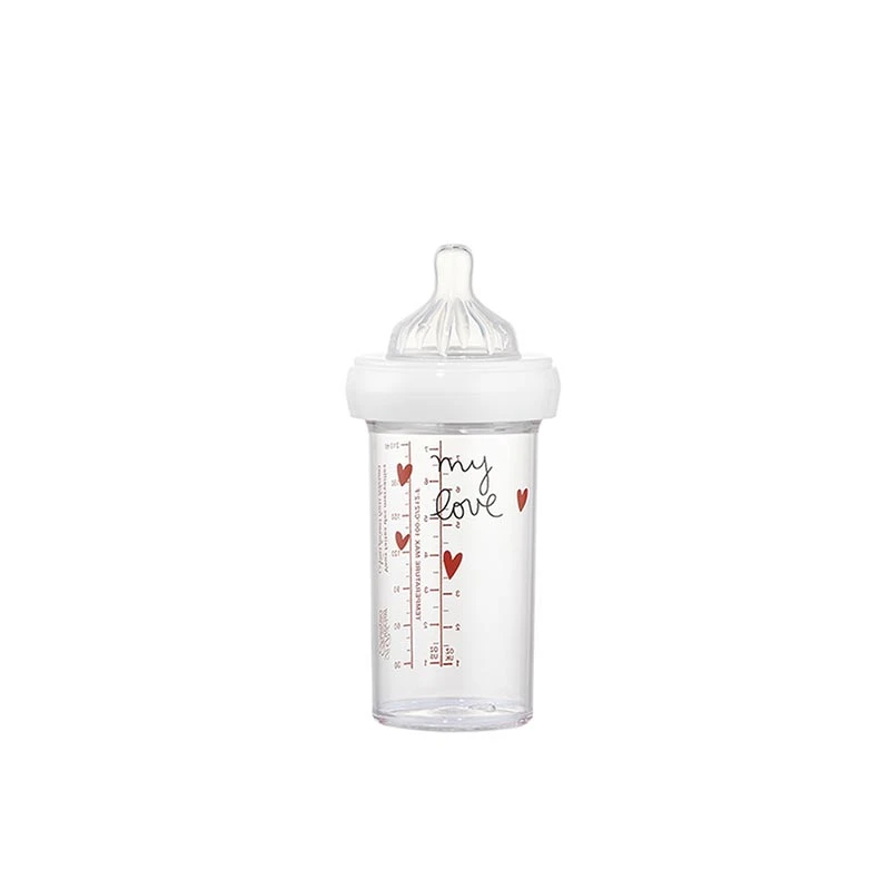 - Le biberon est décoré d’une jolie inscription « My love » et de coeurs rouges.