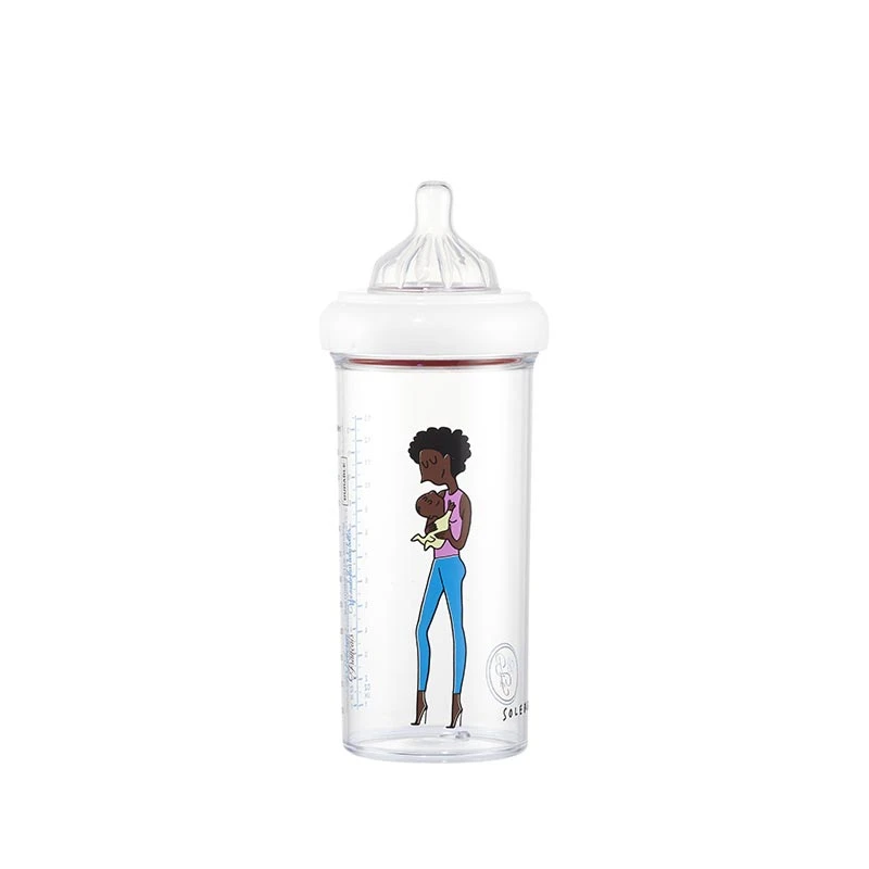 - Le biberon est doté d’un charmant décor de maman avec son bébé par Soledad Bravi.