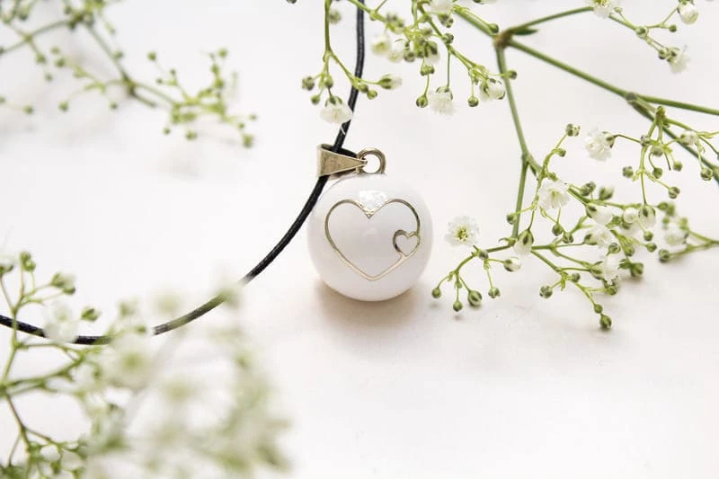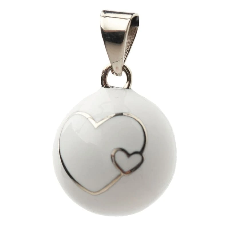 - Le bola blanc double cœur est un pendentif de forme ronde en résine blanche.