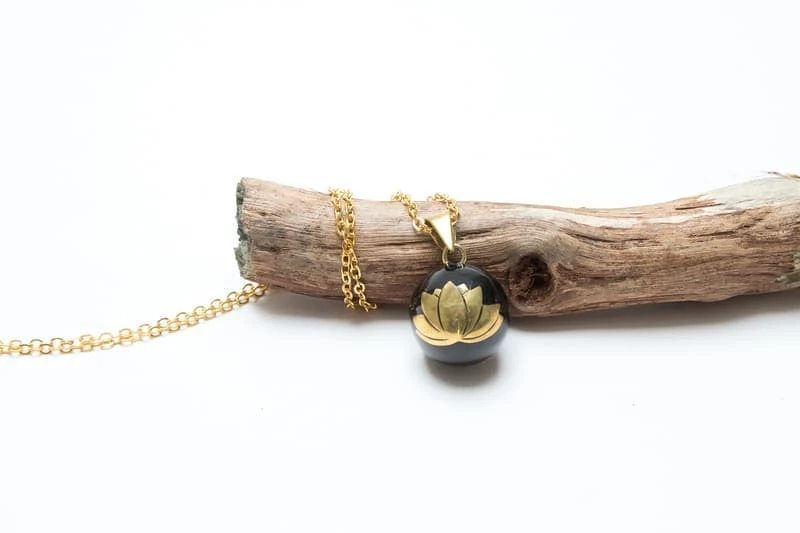 - Le bola noir lotus doré est un pendentif rond orné d’un motif de lotus sur fond noir.
