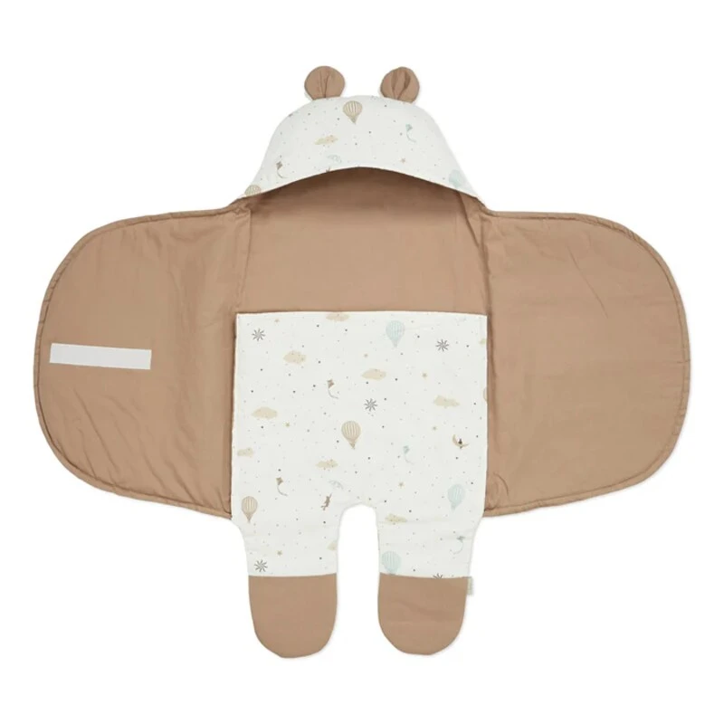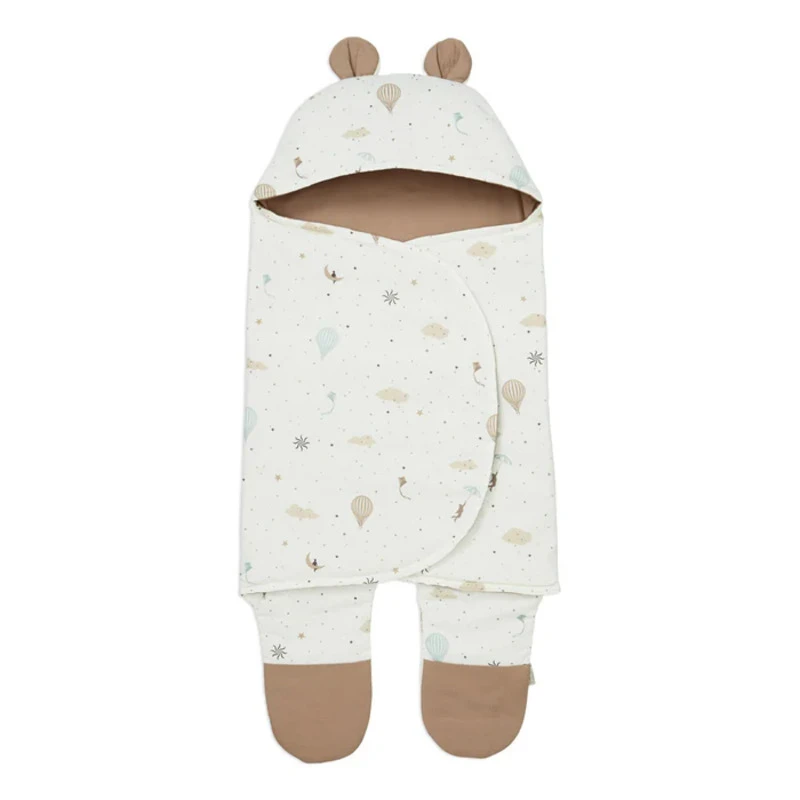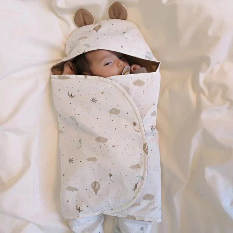 Ravissante couverture d’emmaillotage Bébé Ours à capuche super douce avec des petites pattes et des oreilles d’ours, ornée de magnifiques motifs.