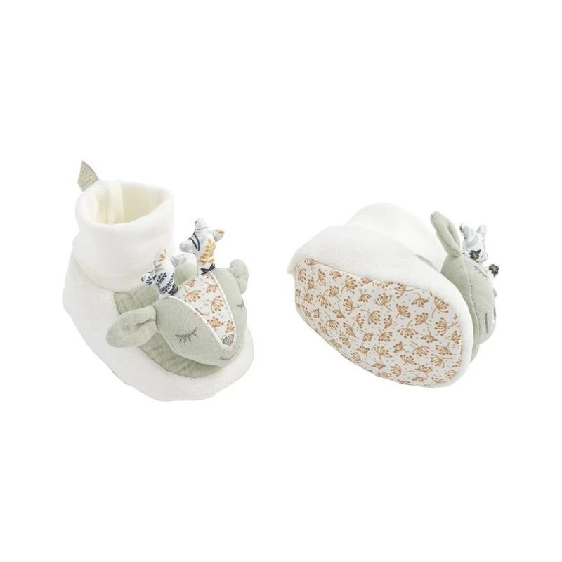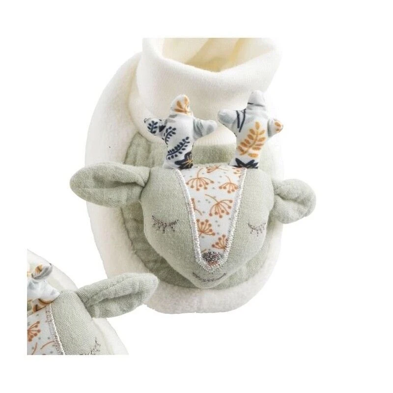 Les chaussons bébé Promenons-nous sont parfaits pour envelopper les petits pieds de votre enfant de douceur et de charme. En blanc et vert clair, chaque chausson arbore une adorable tête de cerf toute mignonne. Conçus pour offrir confort et chaleur, ils sont parfaits pour les premières explorations à la maison.