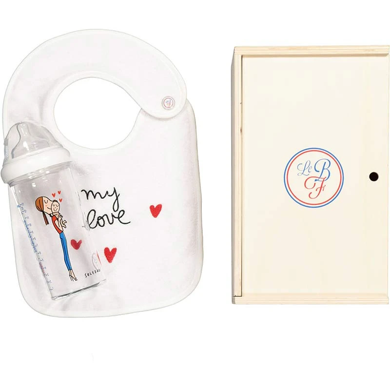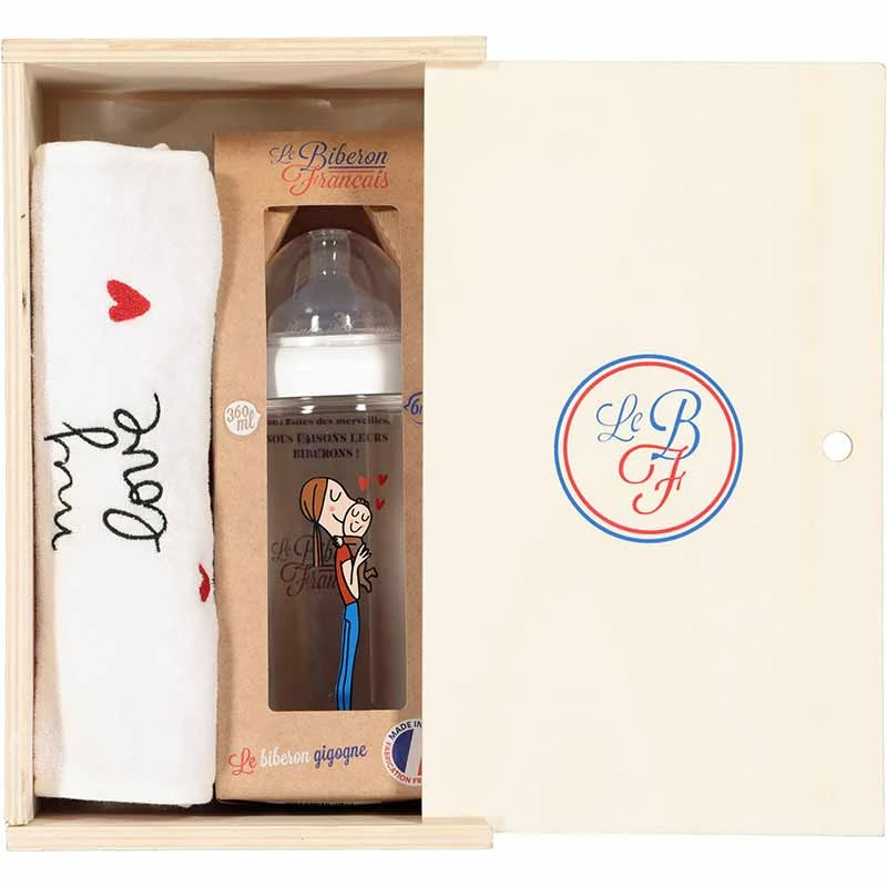 Le coffret biberon 360 ml et bavoir My love de la marque Le Biberon Français est un produit qui se compose d’un biberon 2ème âge, d’un bavoir en coton et d’une boîte plumier en bois.