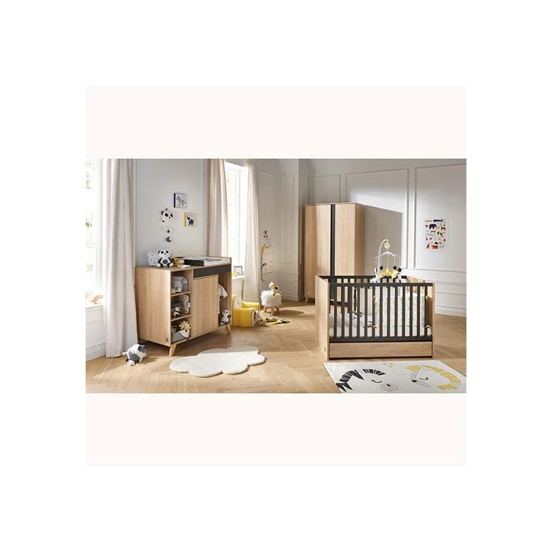 Avec ses lignes épurées et ses pieds obliques, cette commode à décor de chêne doré et rappel gris apporte une vraie touche de déco à la chambre de votre tout-petit.