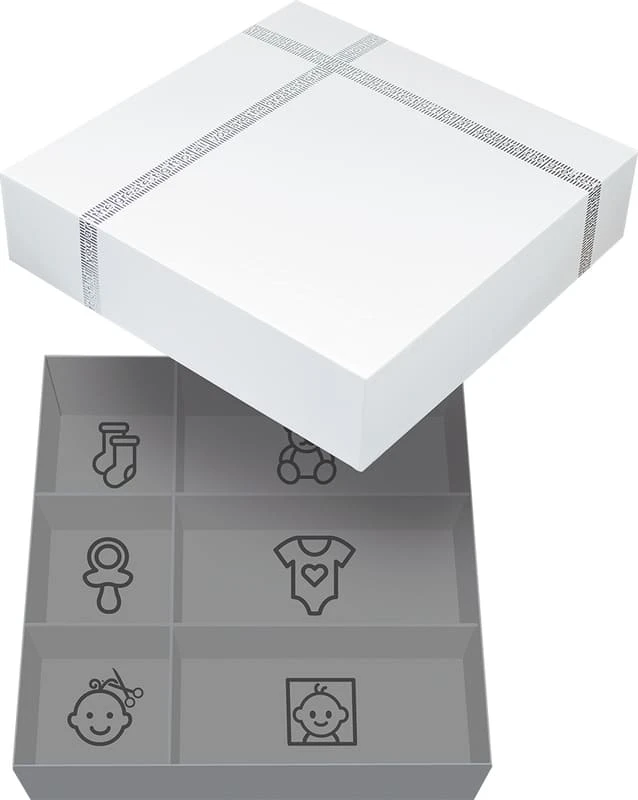- La boîte à mémoire prévoit des compartiments pour y ranger des souvenirs précieux tels qu’une mèche de cheveux, des dents de lait ou encore sa première tétine.
