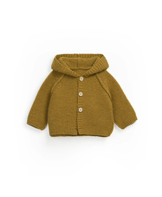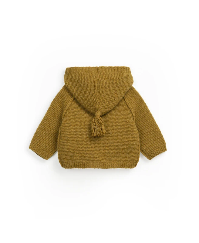 Un joli gilet en laine à capuche pompon Rouille, mixte, conçu et fabriqué au Portugal.