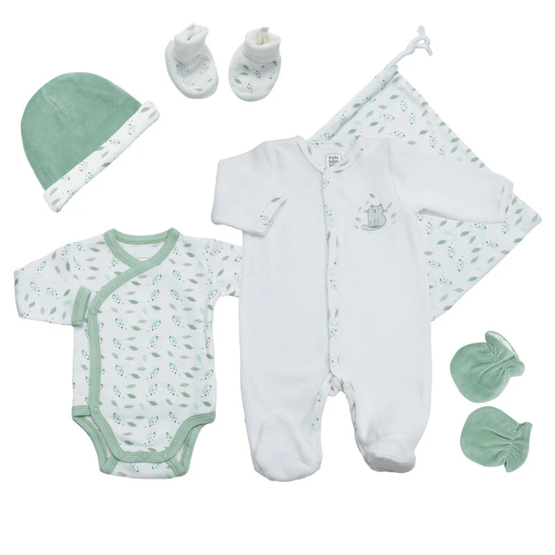 Le Kit Naissance Mon Petit Chat enveloppe votre nouveau-né de douceur et de style dès le premier jour. Composé de cinq pièces essentielles, ce trousseau inclut un pyjama en velours, un body en coton avec ouverture croisée, une paire de moufles, des chaussons et un petit bonnet pour maintenir bébé au chaud.