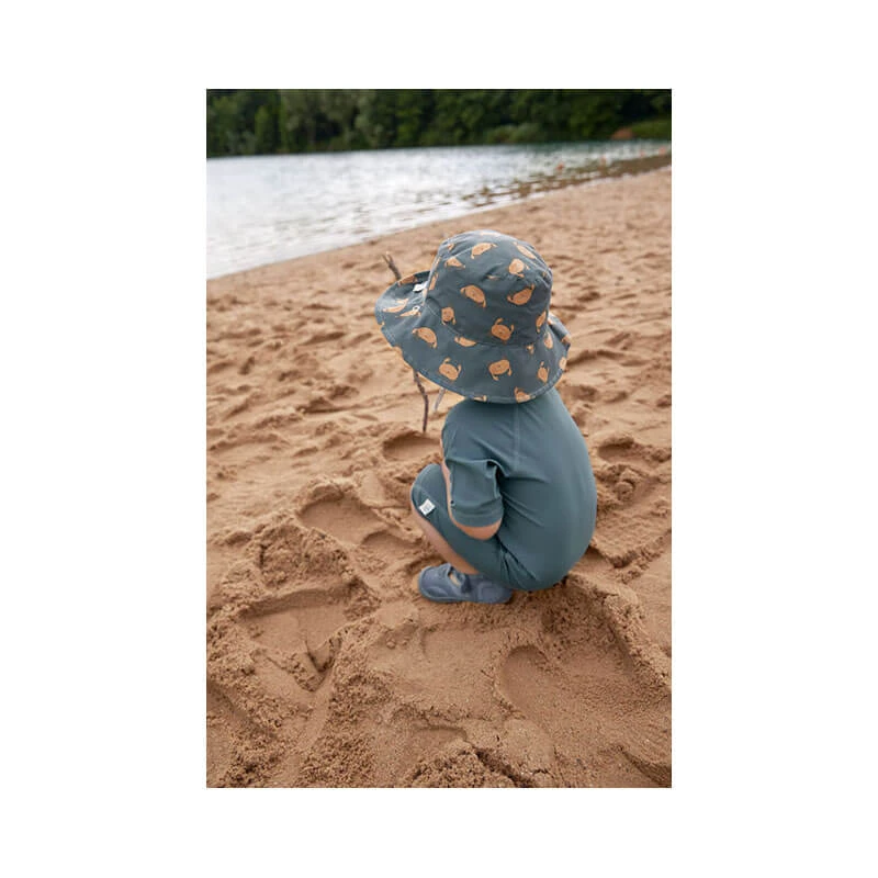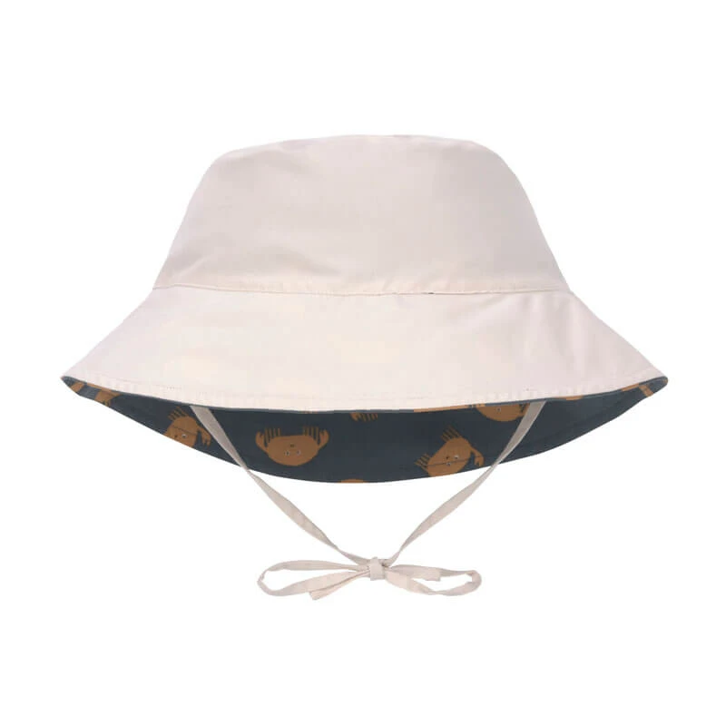 Le chapeau anti-UV réversible Crabe bleu de Lassig protège la tête sensible d’enfants grâce à son indice de protection UV de 80.