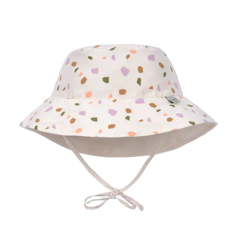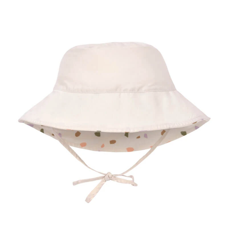 Le chapeau anti-UV réversible Galets multicolore/blanc cassé de Lassig protège la tête sensible d’enfants grâce à son indice de protection UV de 80.