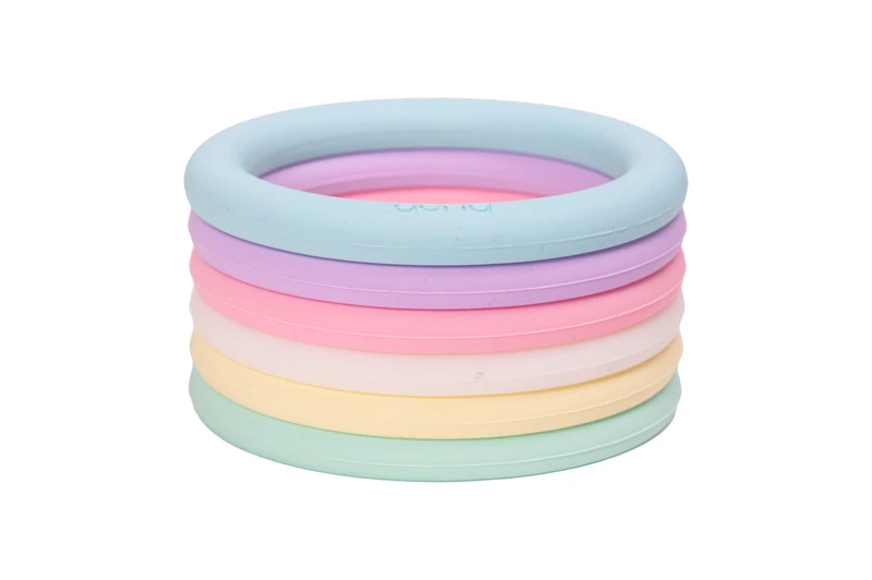 Enfin un anneau de dentition vraiment original. Des formes colorées stimulantes réalisées avec un matériau doux, résistant, pratique et sûr.