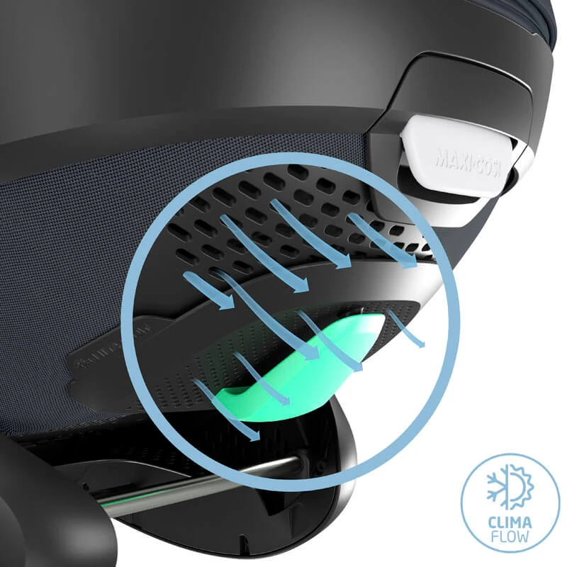 - Le siège-auto est également équipé d’un grand canopy et de la technologie Climaflow qui régule la température et l’humidité.