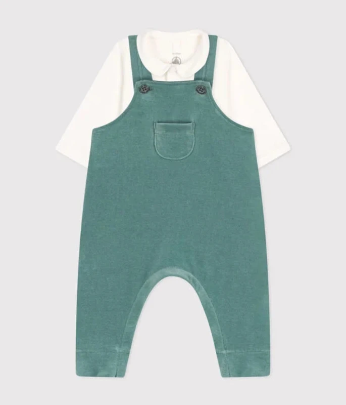 Quelles sont les caractéristiques de l’ensemble 2 pièces body blanc et salopette verte de Petit Bateau ?