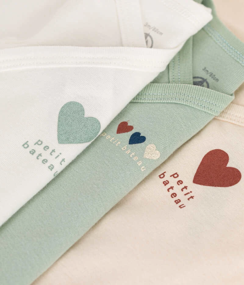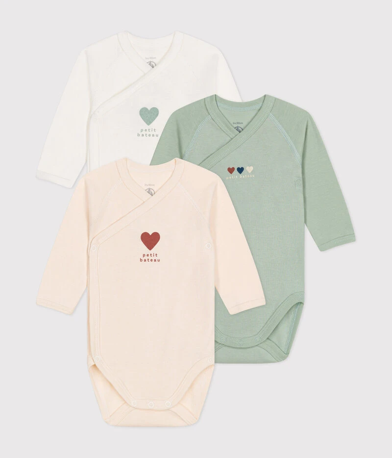 Quelles sont les caractéristiques du Lot de 3 bodies croisés manches longues en coton bébé trio cœur de Petit Bateau ?