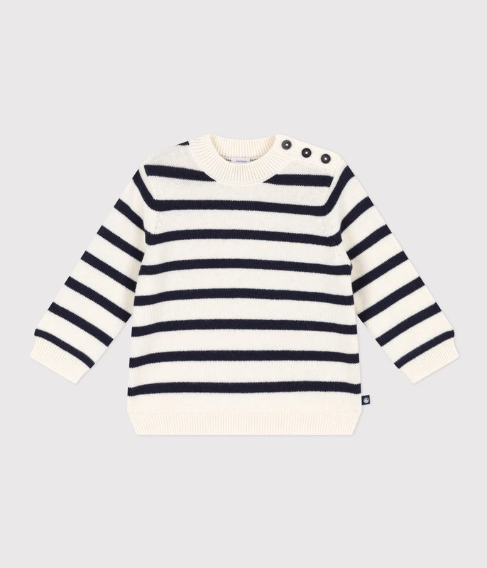Pull bébé à rayures marinières iconiques, en tricot de laine et coton, un mélange doux et chaud pour l’hiver.