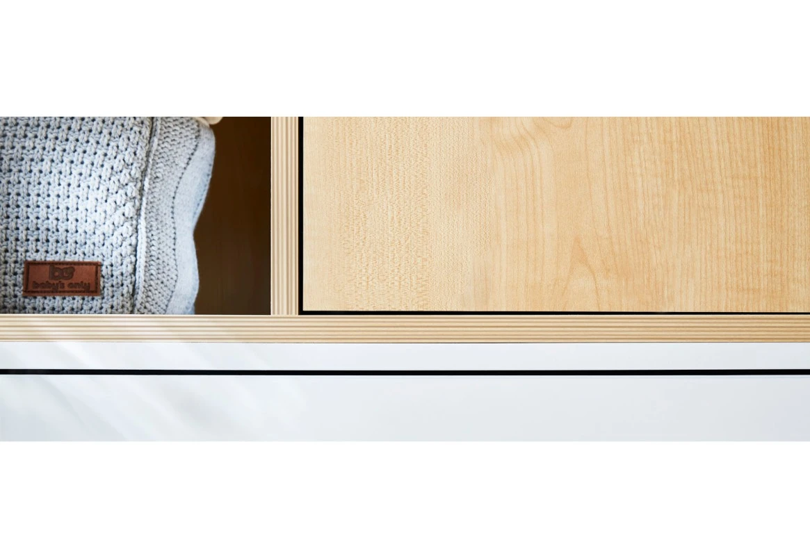 L’armoire Boks de Pinolino offre une solution de rangement pratique et moderne dans la chambre de bébé. En MDF uni laqué blanc et décor érable, elle est équipée de 2 portes, de 2 tiroirs avec 2 compartiments, et de 4 casiers ouverts.
