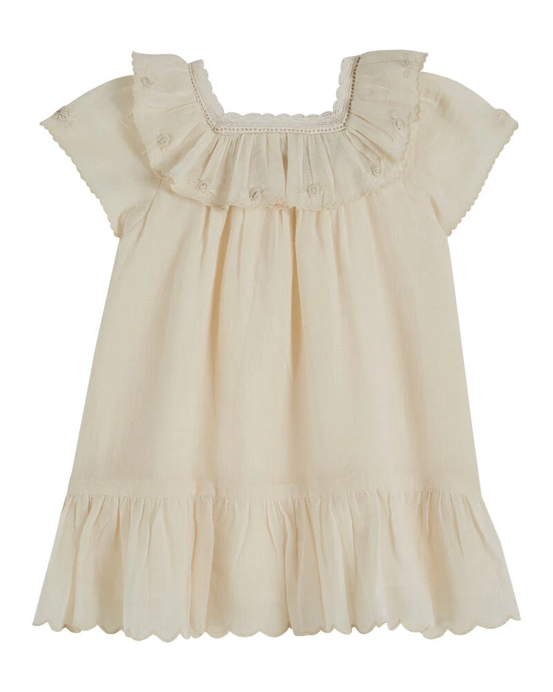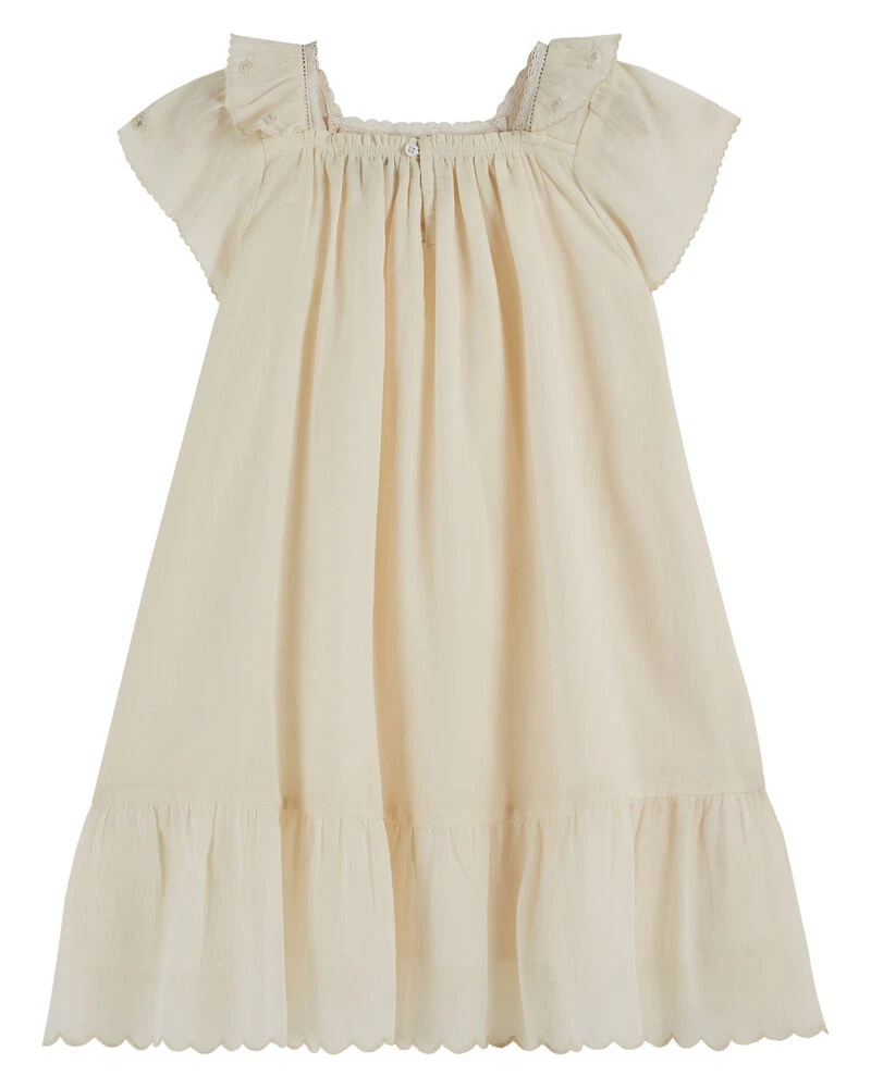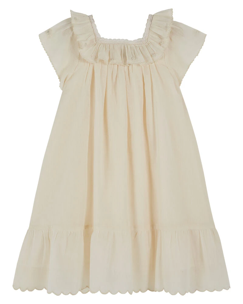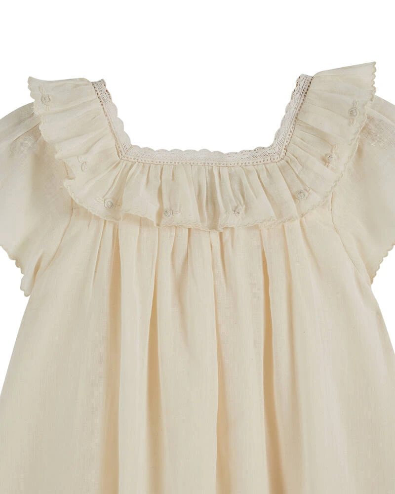 Plongez dans l’élégance intemporelle avec cette somptueuse robe en gaze de coton écrue, un chef-d’œuvre de délicatesse et de charme !