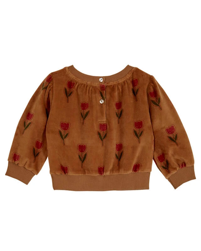 Quelles sont les caractéristiques du sweat-shirt Tulipe Joyeuse en velours marron d’Emile & Ida ?