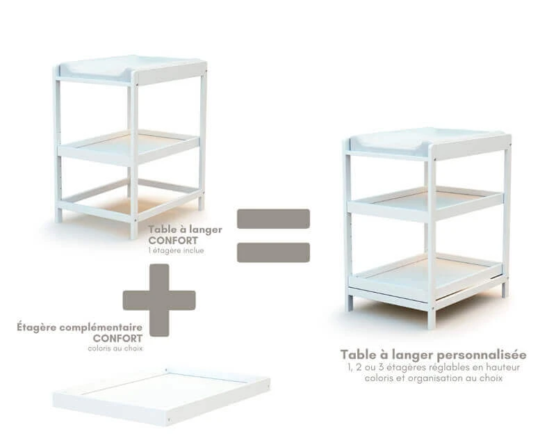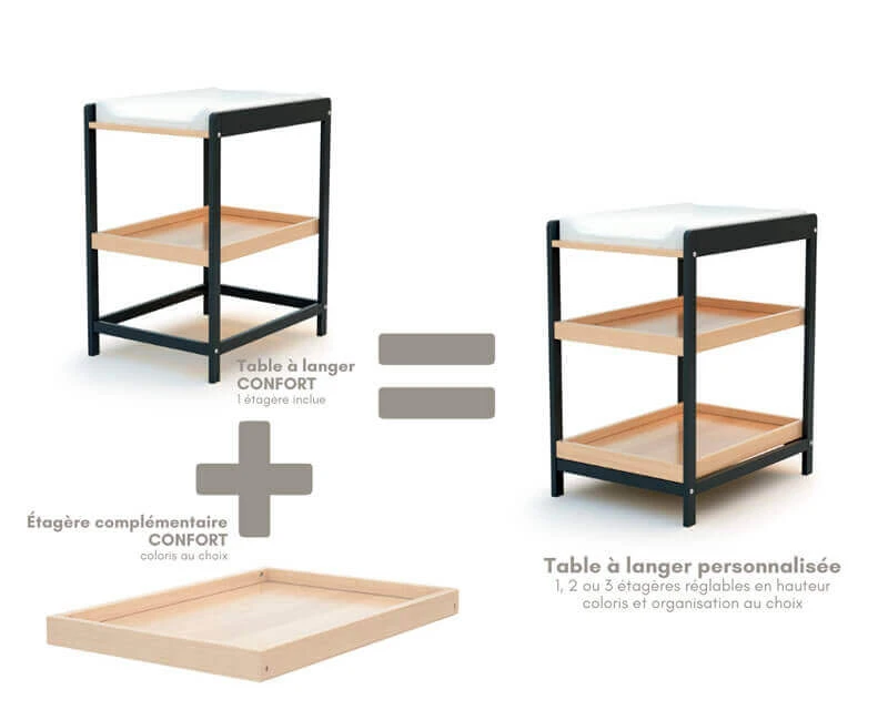 L’ensemble permet de construire une grande table à langer, équipée de nombreux rangements pour avoir toutes les affaires de bébé à proximité lorsque vous le changez.