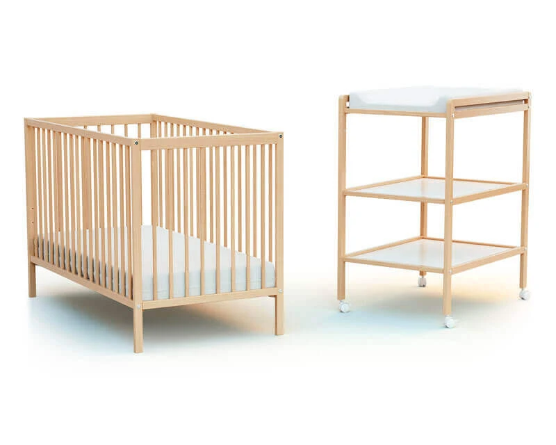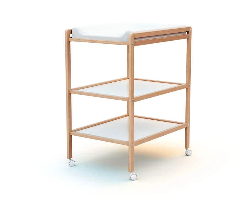 - Composition : structure en hêtre, plan à langer et étagères en panneaux de fibres haute densité mélaminés