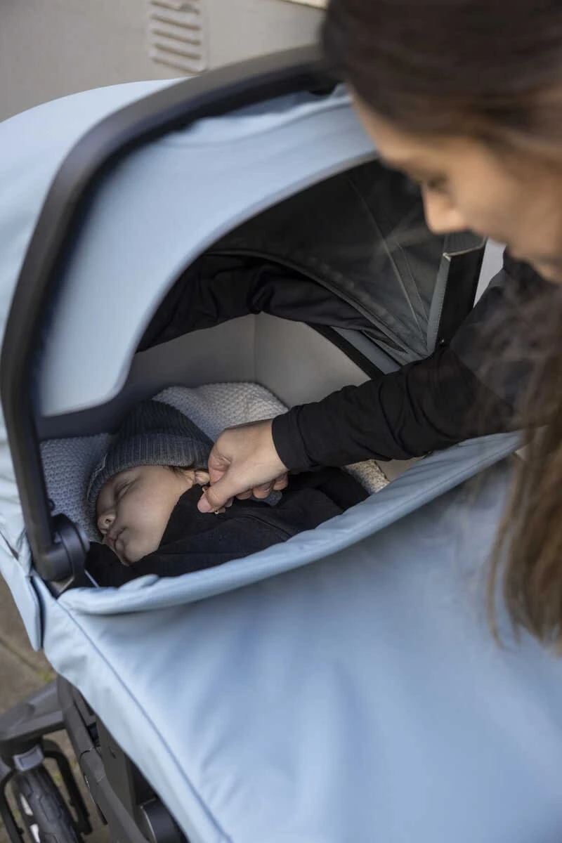 Elle comprend un tablier de berceau et un matelas aéré pour garder votre bébé confortable. Lorsque vous avez terminé votre promenade, le berceau se détache facilement et silencieusement de la poussette.