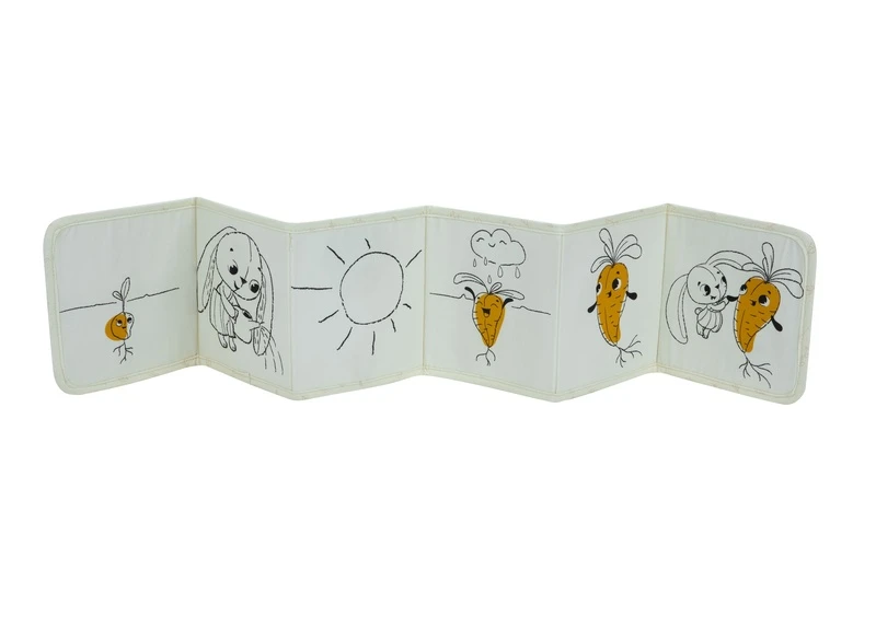 Il comprend des feuilles en coton, des oreilles de lapin en mousseline, un soleil en velours côtelé, un nuage en velours côtelé, une carotte en coton, des rubans en coton, ainsi qu’une courte histoire illustrée pour les bébés.